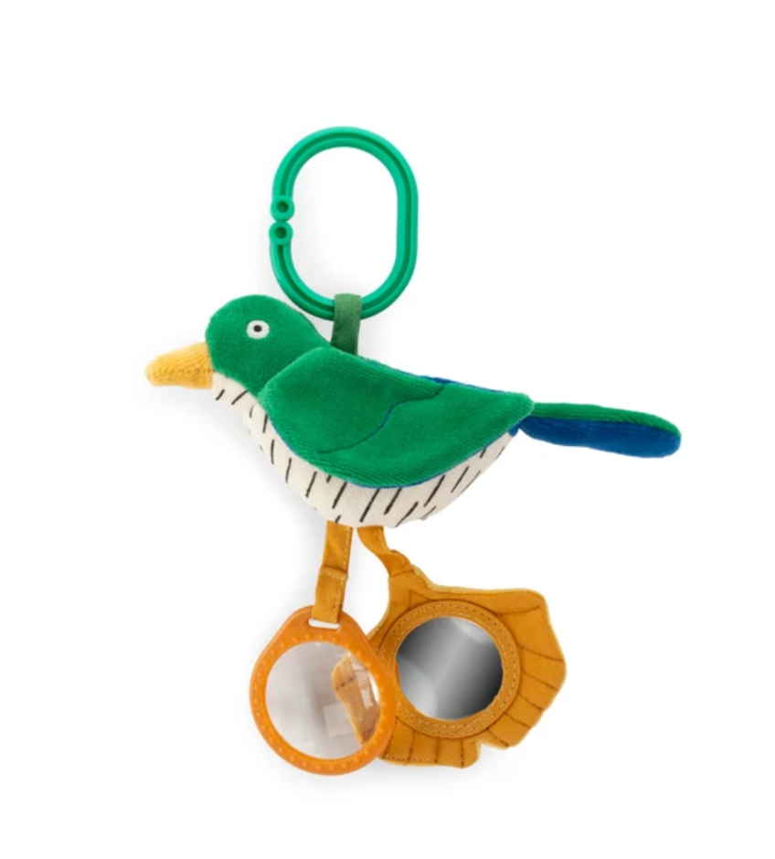 Coucou à suspendre avec dans son ventre une clochette et portant un miroir et un prisme grossissant. Habillé aux couleurs de la forêt Mawa et avec des ailes à frictionner, il permettra à bébé de développer ses sens tout en s'amusant !