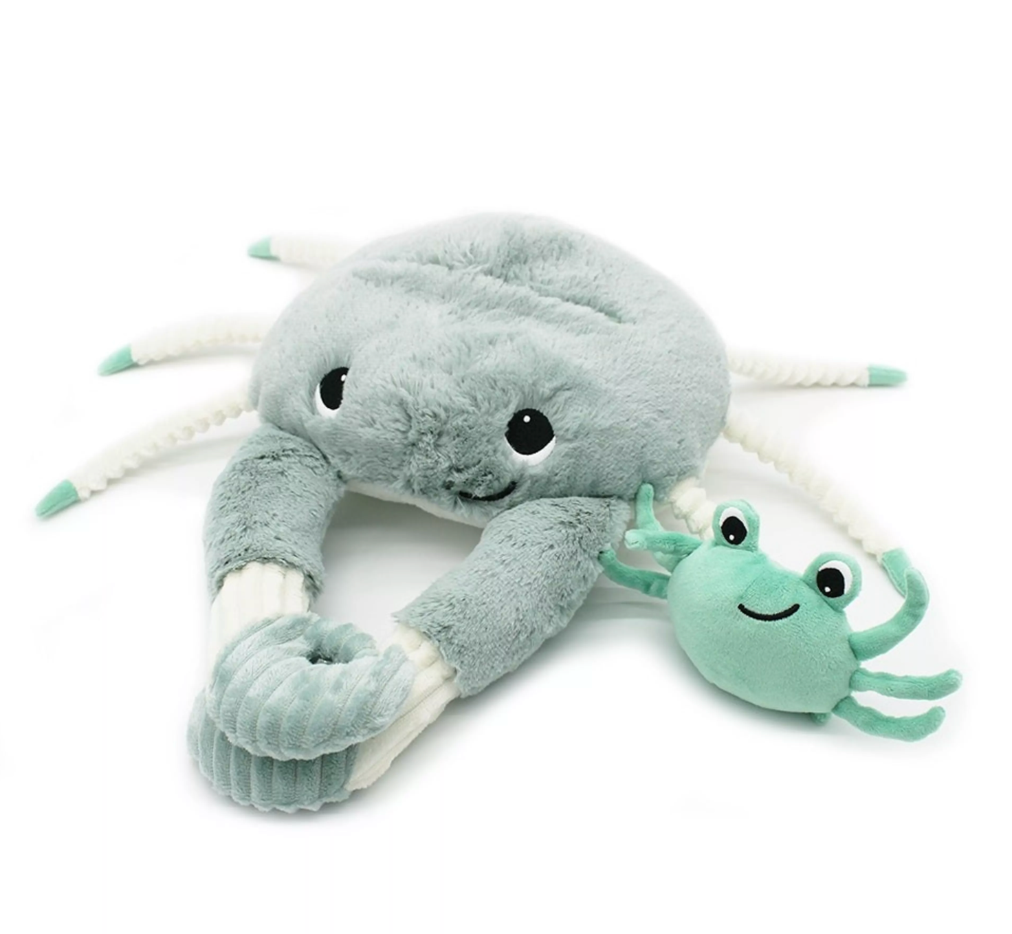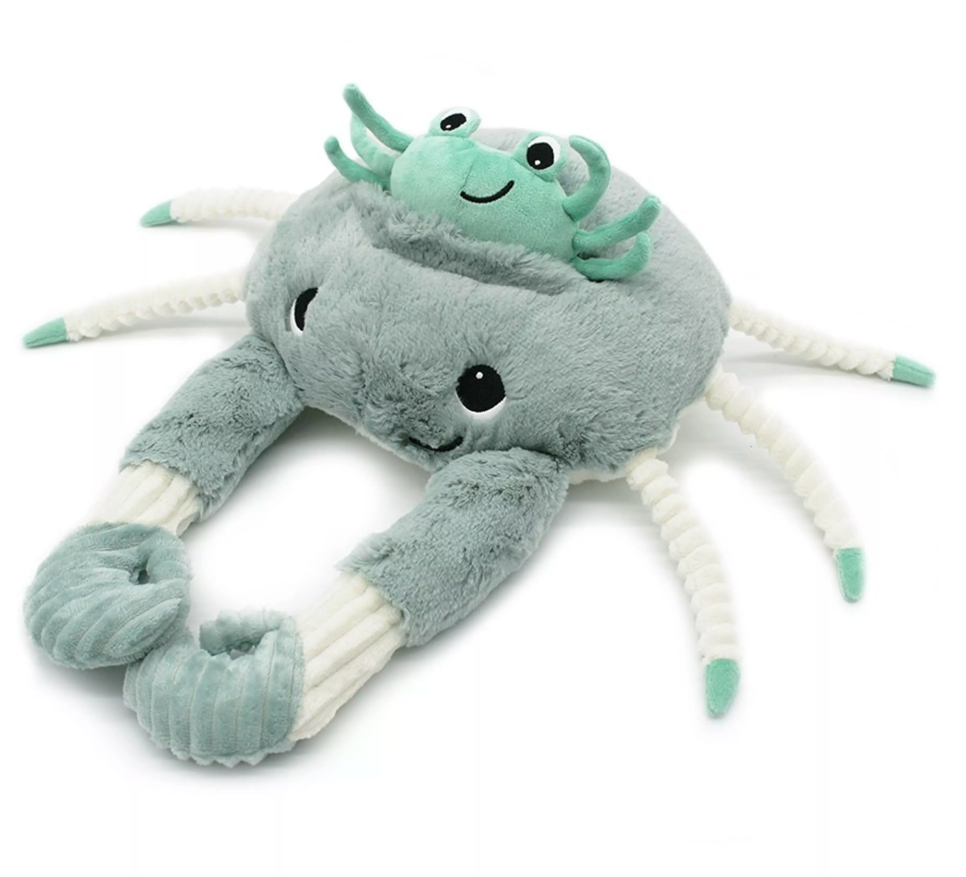 La peluche crabe Ptipotos de 46 cm couleur menthe est vendue avec son bébé caché dans son dos.