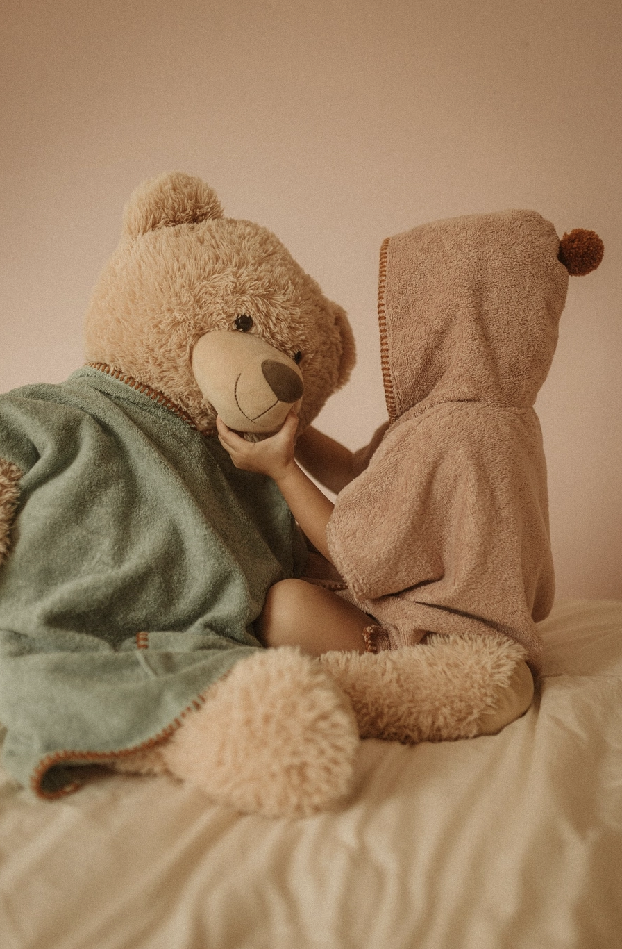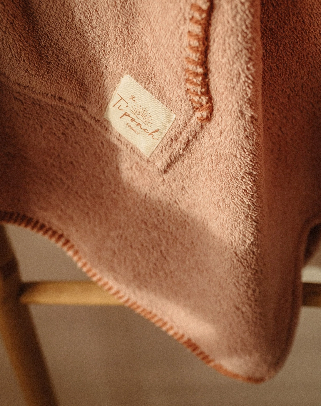 Composition : Poncho = 90% coton biologique 10% polyester recyclé. Pompon = capuche et broderie 60% acrylique 20% laine 20% mohair
