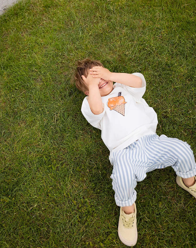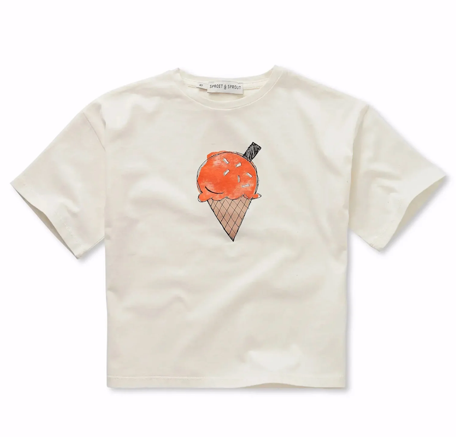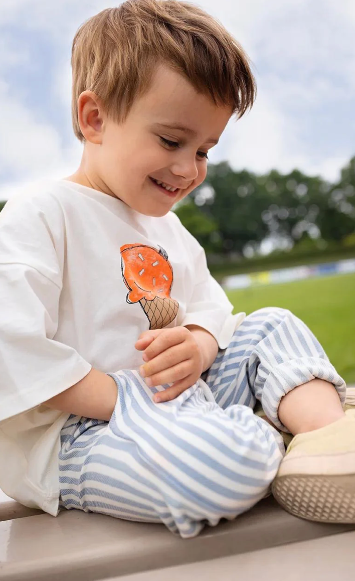 Craquez pour la gourmandise ! Ce t-shirt blanc cassé à motif de cornet de glace apporte une touche ludique, agrémentée de vermicelles pour une note encore plus sucrée. Confectionné en coton 100 % biologique, il est respirant, doux et idéal pour les aventures estivales.