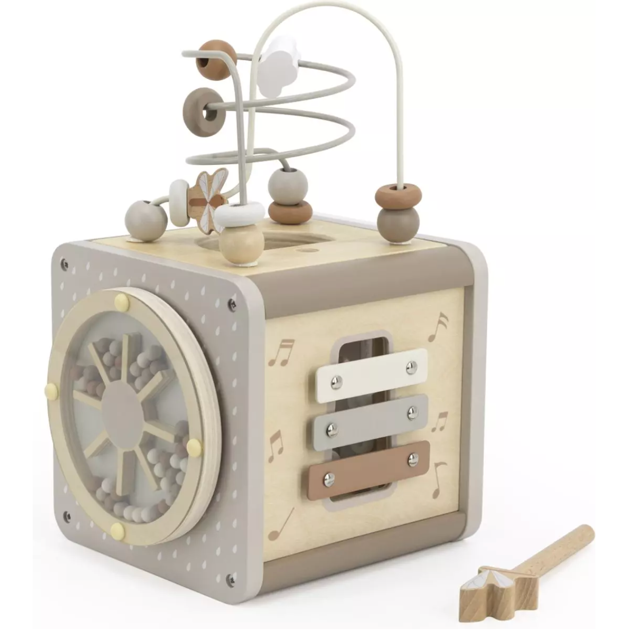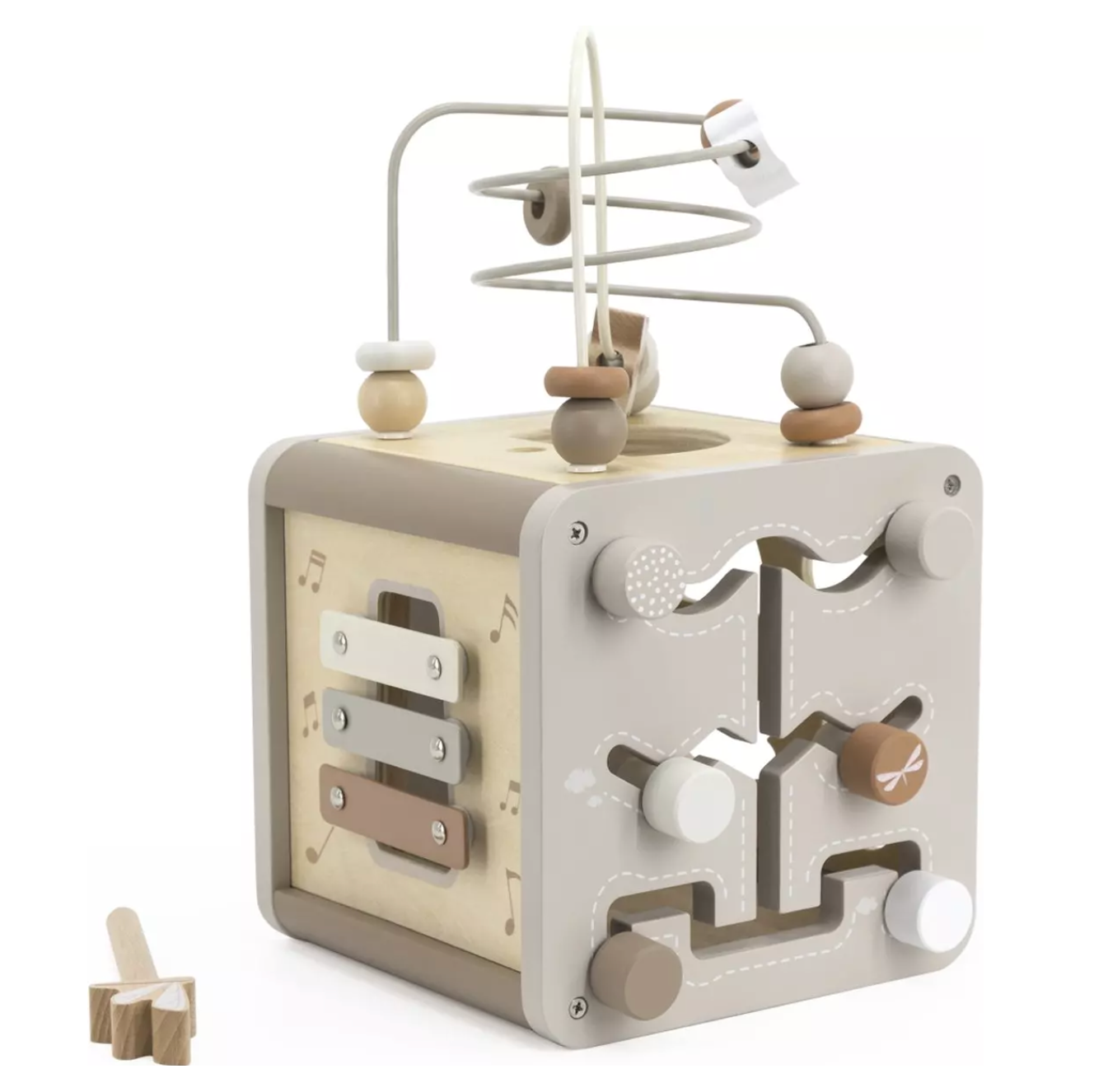 Le cube d'activités 5 en 1 comprend un trieur de formes, des engrenages, un labyrinthe de pistes, un xylophone et un labyrinthe de perles pour garder les enfants engagés.