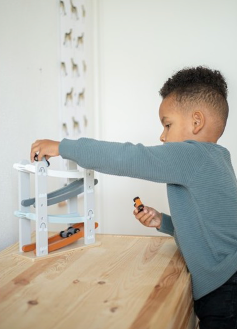 Avec ce rail de voiture coulissant en bois, vous stimulez la motricité de votre tout-petit.